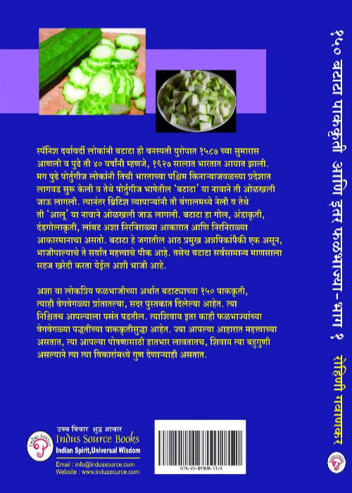 150 बटाटा पाककृती आणि इतर फळभ पुस्तक स्पॅनिश दर्यवादी लोकांनी बटाटा ही वनस्पती युरोपात 1587 च्या सुमारास आणली व पुढे ती 40 वर्षांनी म्हणजे 1627 सालात भारतात आयात झाली। मग पुढे पोर्तुगीज लोकांनी तिची भारताच्या पश्चिम किनाऱ्याजवळच्या प्रदेशात लागवड सुरू केली व तेथे पोर्तुगीज भाषेतीले 'बटाटा' या नावाने ती ओळखली जाऊ लागली। त्यानंतर ब्रिटिश व्यापाऱ्यांनी री बंगालमध्ये नेली व तेथे ती 'आलू' या नावाने ओळखली जाऊ लागली।बटाटा हा गोल, अंडाकृती, दंडगोलाकृती, लांबट अशा निरनिराळ्या आकारात आणि निरनिराळ्या आकारमानाचा असतो। बटाटा हे जगातील आठ प्रमुख अन्नपिकांपैकी एक असून, भाजीपाल्याचे ते सर्वात महत्त्वाचे पीक आहे। तसेच बटाटा सर्वसामान्य माणसालाही सहज खरेदी करता येईल; अशी भाजी आहे। अशा या लोकप्रिय फळभाजीच्या म्हणा, कंद म्हणा, बटाट्याच्या 150 पाककृती, त्याही वेगवेगळ्या प्रांतातल्या सदर पुस्तकात दिलेल्या आहेत। त्या निश्चितच आपल्याला पसंत पडतील। त्याशिवाय इतर काही फळभाज्यांच्या पककृतीदेखील दिलेल्या आहेत ज्या आपल्या आहारात महत्त्वाच्या असतात, त्या आपल्या पोषणासाठी हातभार लावतातच, शिवाय त्या बहुगुणी असल्याने विकारांमध्ये त्या गन देणाऱ्या असतात।