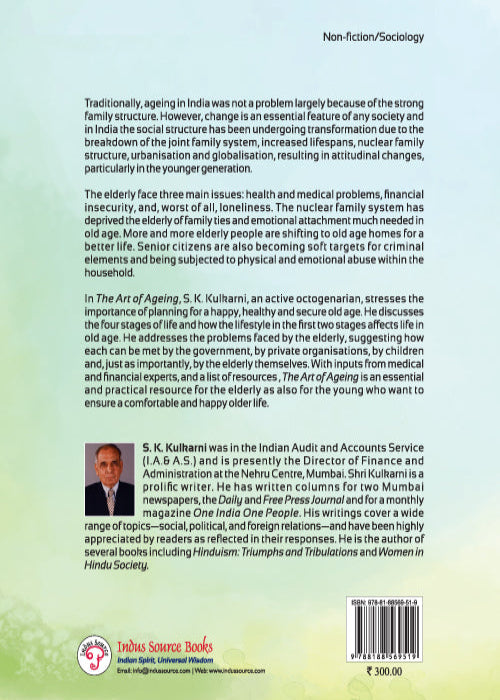 In The Art of Ageing, S. K. Kulkarni, an active octogenarian, stresses the importance of planning for a happy, healthy and secure old age. He discusses the four stages of life and how the lifestyle in the first two stages affects life in old age. He addresses the problems faced by the elderly, suggesting how each can be met by the government, by private organisations, by children and, just as importantly, by the elderly themselves. With inputs from medical and financial experts, and a list of resources, The Art of Ageing is an essential and practical resource for the elderly as also for the young who want to ensure a comfortable and happy older life.