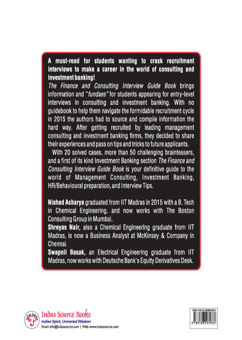 The Finance and Consulting Interview Guide brings information and fundaes for students appearing for campus recruitment interviews in consulting and finance. With no guidebook to help them navigate the tough recruitment course in 2015 the authors had to source information and put fundaes together the hard way. After getting recruited by leading consulting and finance companies, they decided to share their experiences and pass on tips and tricks to future batches of students.