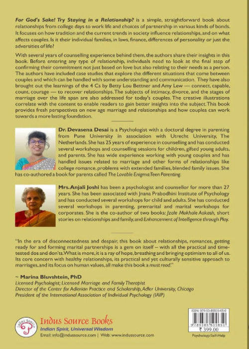For God’s Sake! Try Staying in a Relationship? is a simple, straightforward book about relationships from college days to work life and choices of partnership in various kinds of bonds. It focuses on how tradition and the current trends in society influence relationships, and on what affects couples. Is it their individual families, in laws, finance, differences of personality or just the adversities of life? With several years of counselling experience behind them, the authors share their insights in this book. Before entering any type of relationship, individuals need to look at the final step of confirming their commitment not just based on love but also relating to their needs as a person. The authors have included case studies that explore the different situations that come between couples and which can be handled with some understanding and communication. They have also brought out the learnings of the 4 Cs by Betty Lou Bettner and Amy Lew connect, capable, count, courage to recover relationships. The subjects of intimacy, divorce, and the stages of marriage over the life span are also addressed for today’s couples. The creative illustrations correlate with the content to enable readers to gain better insights into the subject. This book provides fresh perspectives on new age marriage and relationships and how couples can work towards a more lasting foundation. In the era of disconnectedness and despair, this book about relationships, romances, getting ready for and forming marital partnerships is a gem on itself – with all the practical and time-tested dos and don'ts. What is more, it is a ray of hope, breathing and bringing optimism to all of us. Its core concern with healthy relationships, its practical and yet culturally sensitive approach to marriages, and its focus on human values, all make this book a must read.” Marina Bluvshtein, PhD Licensed Psychologist; Licensed Marriage and Family Therapist Director of the Center for Adlerian Practice and Scholarship, Adler University, Chicago President of the International Association of Individual Psychology (IAIP).