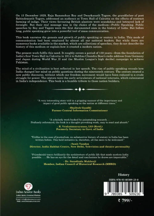 Coeval with print journalism, but more directly concerned with politics, public speaking emerged as a limb of mass communication in India in the nineteenth century. No national leader was able to ignore the power of speech. A crop of quality speeches emerged during the late nineteenth and early twentieth century period. This book is the first attempt to reckon with that genesis and development of oratory in India. It promises to reconnect us with the foundational legacy of modern India, which transformed us from subjects into citizens.